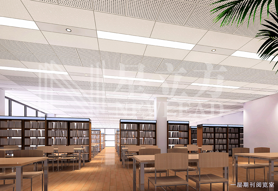 学校图书阅览室,大孔格栅和跌级龙骨的组合应用,配套灯具散发的柔和光线